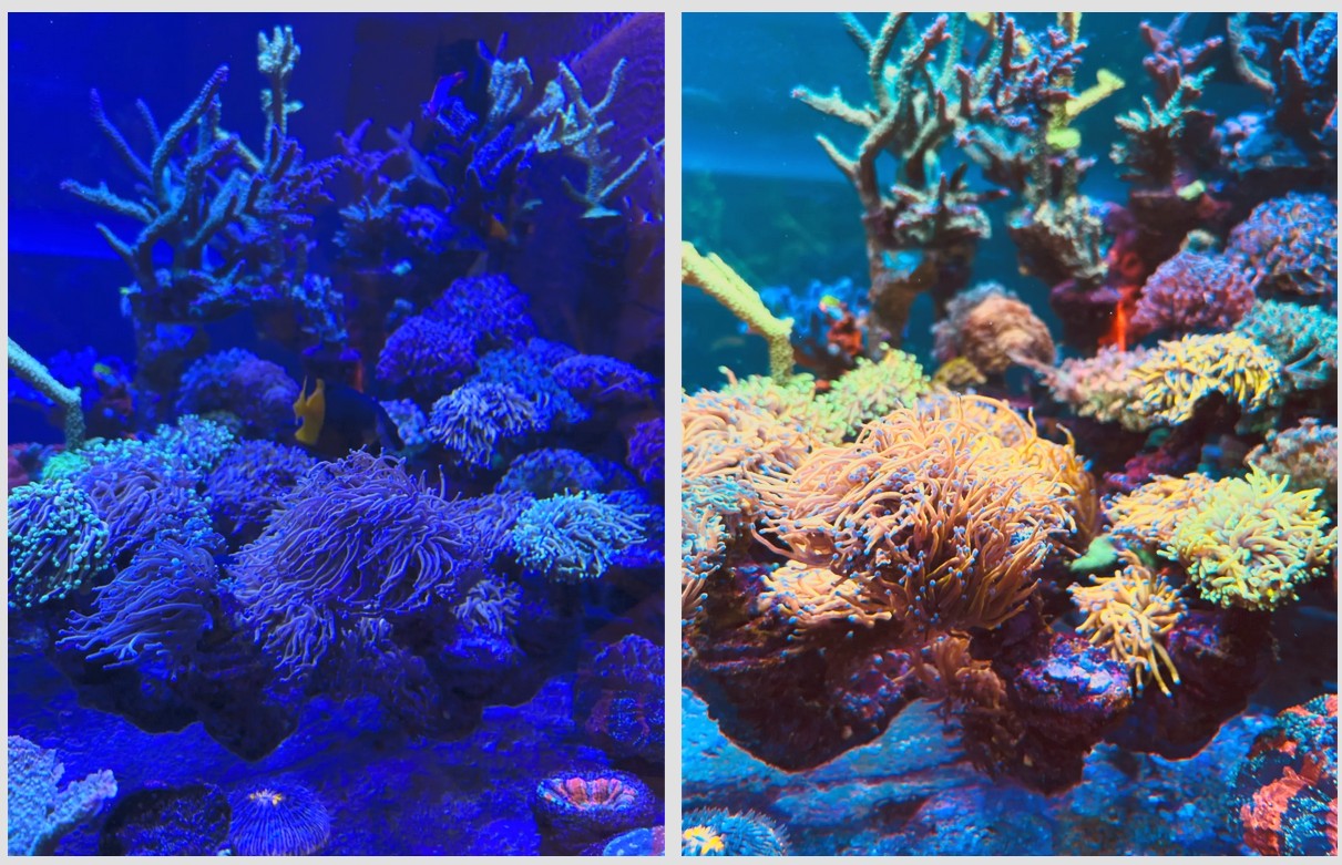 Funzionano tagliando gran parte dello spettro blu: vicino UV intorno ai 400–420 nm, blu intenso, royal blue e parte del ciano. Il risultato è sì una riduzione del “velo blu”, ma anche la perdita di quella componente di luce che fa brillare i coralli in modo fluorescente.