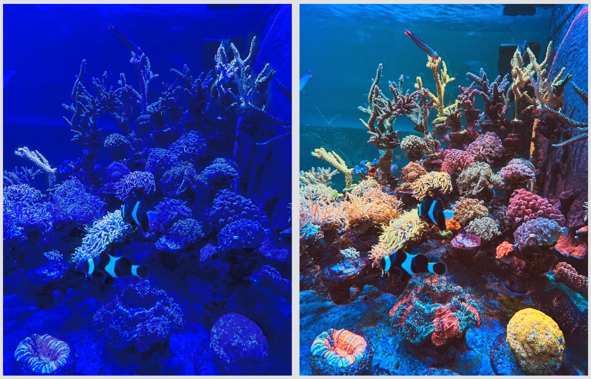 viene preservata una porzione significativa della luce near-UV intorno ai 420 nm e inferiori, esattamente quella che esalta il “pop” fluorescente dei coralli;